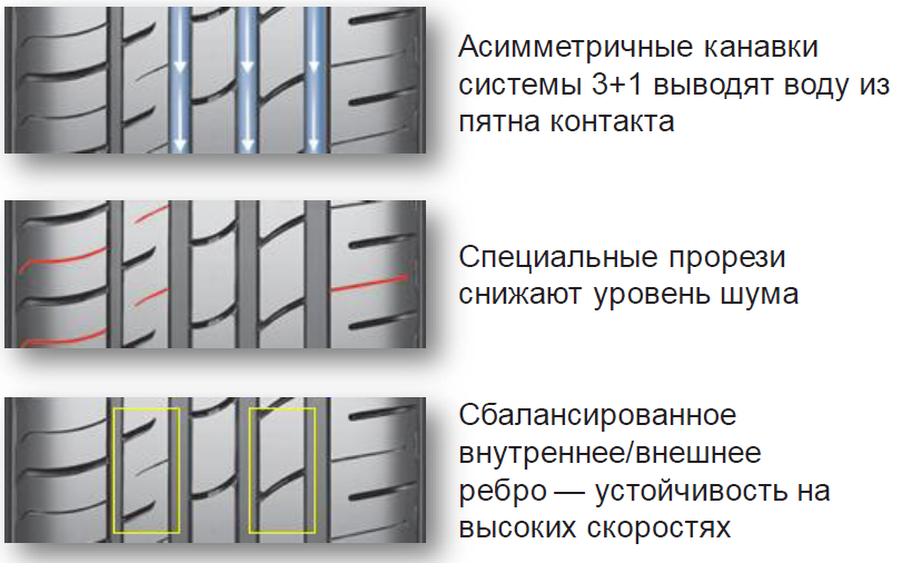 - Стойкость к аквапланингу — в дополнение к 3 основным водоотводящим канавкам во внешней плечевой зоне располагается ещё одна более узкая бороздка, ускоряющая рассеивание жидкости в пятне контакта.